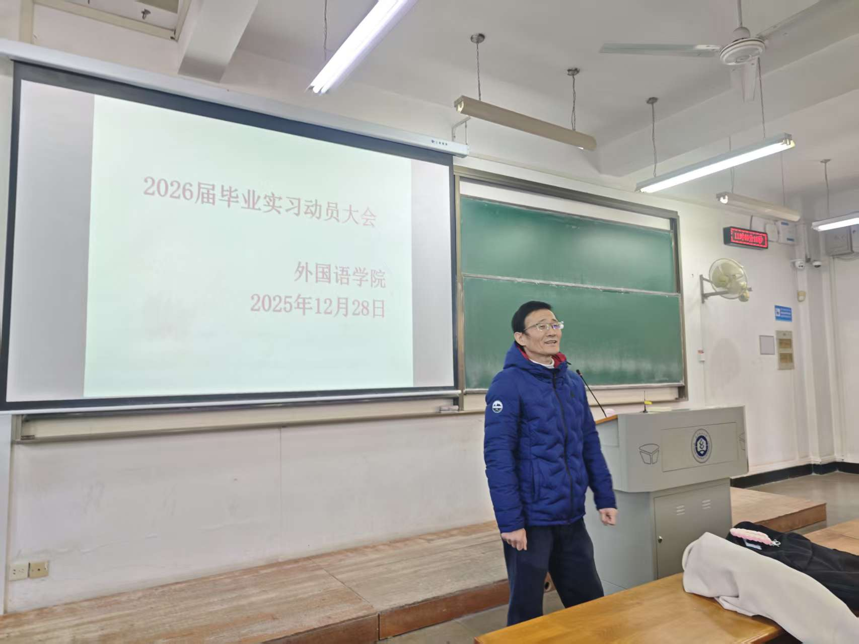 12月28日中午,bv伟德国际1946在阳光校区3号教学楼115教室举办2026届学生实习动员大会。英语专业教研室主任王越老师、商务英语专业教研室主任吴志杰老师、商务英语专业本科生导师黎健老师出席会议,为即将踏上实习岗位的学生们进行动员指导。
