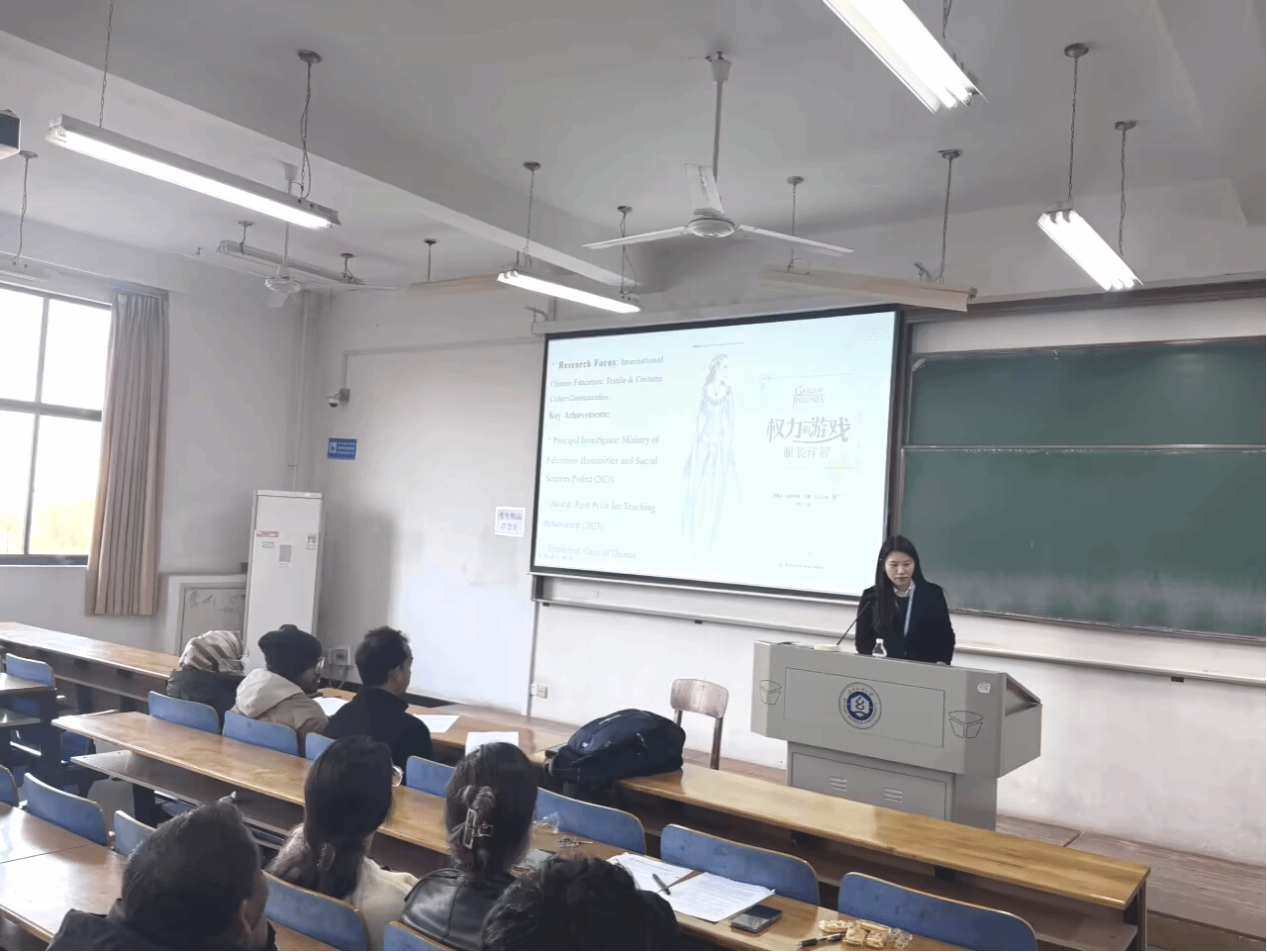 周丹结合自己翻译《权力的游戏:服装详解》的经历,指出服装不仅是面料的堆砌,更是无声的语言。她从留学生日常生活中面临的“面料识字”痛点出发,引出了本次讲座的主旨——解码隐藏在纺织品背后的语言密码与文化基因。