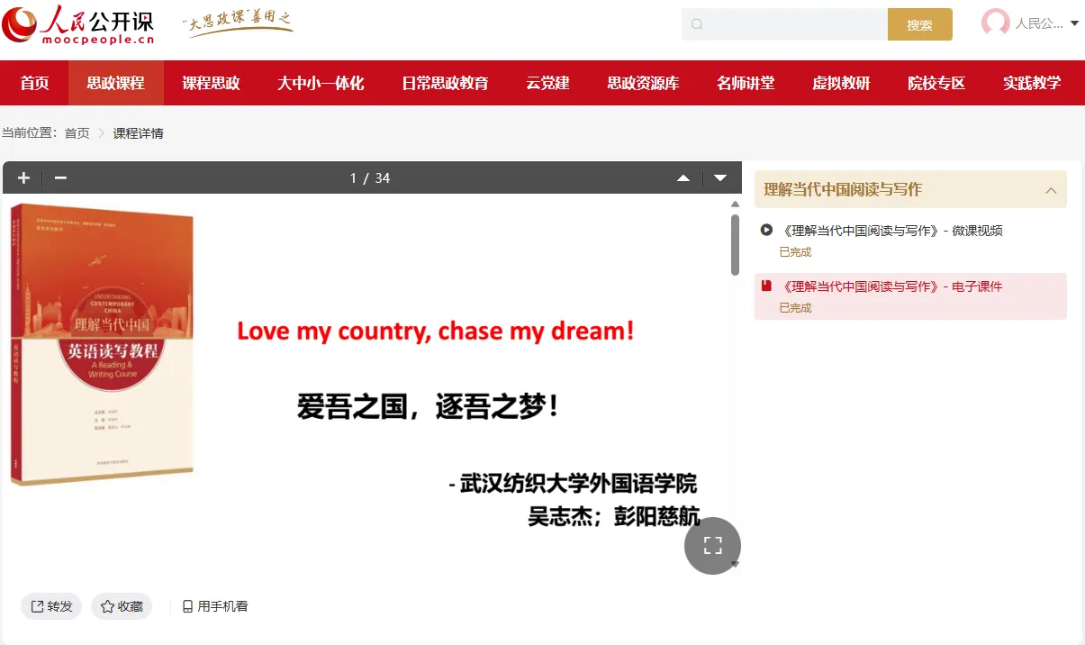 《理解当代中国阅读与写作》是我校面向全校英语类专业本科生及研究生开设的专业核心课程,是落实中宣部、教育部有关“理解当代中国”三进工作的重要载体。课程带领学生细读习近平新时代中国特色社会主义思想相关选篇,在全面、准确理解原文思想内涵基础上,进行应用、分析、评价和创造等高阶思维活动;引导学生通过课文学习和延伸阅读,把握核心要义和内在逻辑,并运用该理论体系解释中国实践,加深对中国理论和中国实践的认识,培养理论思维和分析问题与解决问题的能力。课程注重指导学生进行语言学习、合作探究,不断提高创新能力及中国故事讲述能力。《理解当代中国阅读与写作》课程在被列为“人民公开课大思政示范课”之前,已被评为校课程思政示范课程。另外,课程集育人与育才一体、理论与实践相结合,参与了“武汉新城大中小学思政课一体化共同体建设”工作,服务大中小思政课一体化教育,开拓了高校课程思政的新思想、新方法,为新时代高校外语类课程思政提供了新的教育样态。
