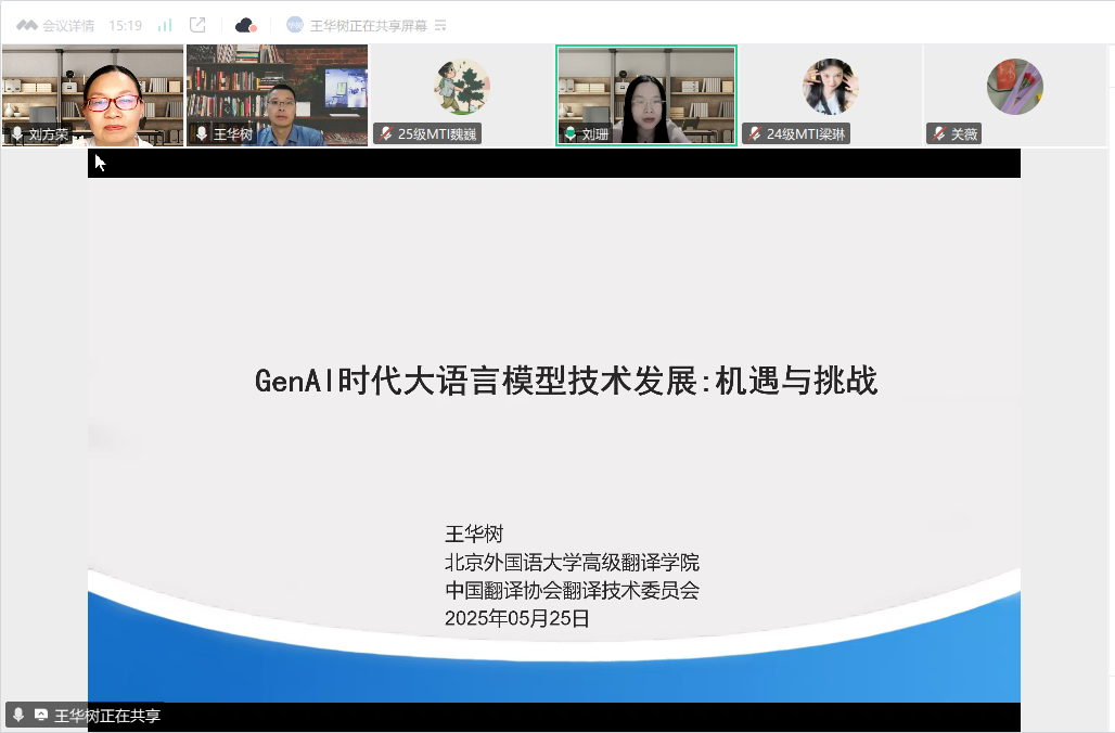 5月25日晚,伟德victor1946第817期阳光论坛暨bv伟德国际1946第69期崇文讲堂在线上成功举办。本次论坛特邀北京外国语大学人工智能与语言教育研究中心王华树教授作题为"GenAI时代大语言模型技术发展:机遇与挑战"的学术讲座,讲座由MTI教育中心主任、“人工智能赋能翻译技术”教学团队负责人刘珊主持。