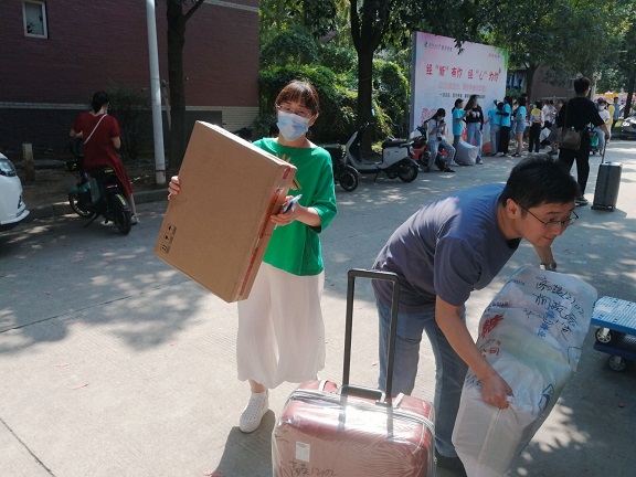 辅导员还在开学前与重点学生一对一进行沟通交流,在重点学生进校时,志愿者老师亲自上阵,帮助新生在宿舍安顿下来。