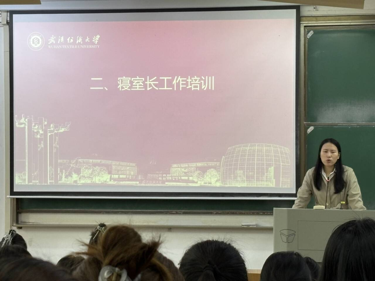 在业务培训环节,石亚楠老师结合实际案例,从“寝室长角色定位”“日常管理规范”“突发事件处理”三个方面展开讲解。她重点强调了消防安全、用电规范、晚归登记等注意事项,并针对秋冬季流感高发期,提醒寝室长做好卫生监督与健康提醒。会议最后,多位优秀寝室长代表结合自身工作实际,分享了他们在宿舍管理、矛盾调解、学风促进、活动组织等方面的有效经验和心得体会。刘乐颖同学介绍了“寝室文化共建”经验,通过组织读书会、生日惊喜等活动增强集体凝聚力,以生动的案例和实用的方法引发了在场同学的深入思考和热烈讨论。通过交流互鉴,各位寝室长拓宽了工作思路,学习了先进做法,增强了做好宿舍管理工作的信心与能力。
