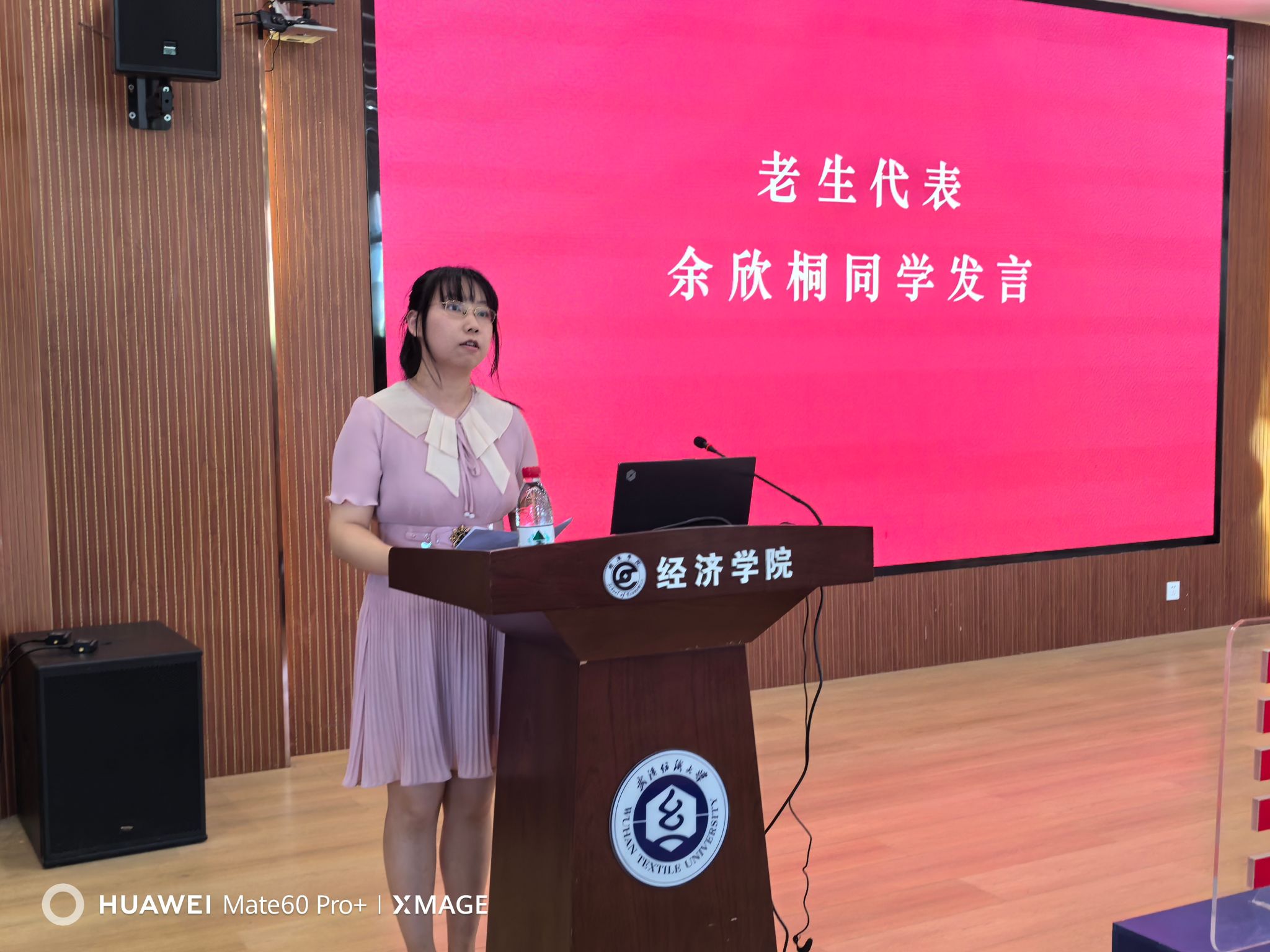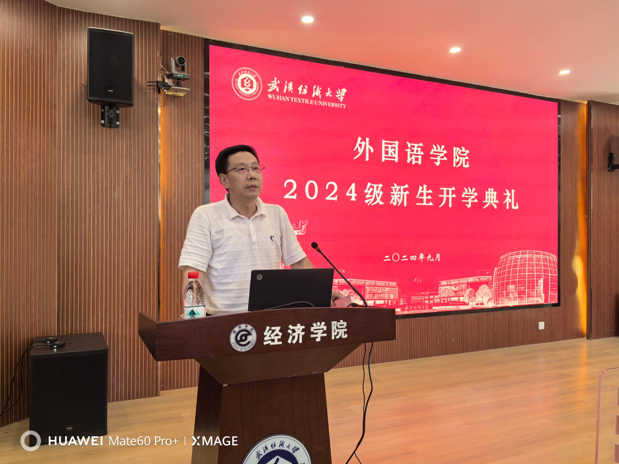 胡中原代表学院欢迎2024级新生的到来,致意全体新生从进入纺大开始就有了“纺大人”这一新身份。胡书记娓娓道来优秀校友的故事和校园环境的点滴变化,鼓舞全体新生在最宝贵的年华、在最美丽的校园养成终身学习的习惯,并用“四新”祝福全体新生:“跨进纺大新校园,谱写外院新篇章,勇攀人生新高峰,再创学业新辉煌。”