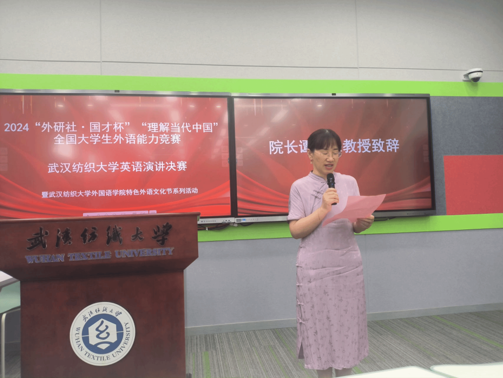 本次比赛旨在提高学生的外语表达能力,用英语生动传播中国故事、中国智慧,助力培养有家国情怀、全球视野、专业本领的国际化高层次外语专业人才。比赛现场座无虚席,选手开讲前,院长谭燕保教授首先致辞,谭院长表示本次比赛不仅是一场语言的较量,更是一次思想的碰撞。她鼓励学生们继续努力学习,用外语讲好中国故事,传播中国声音。