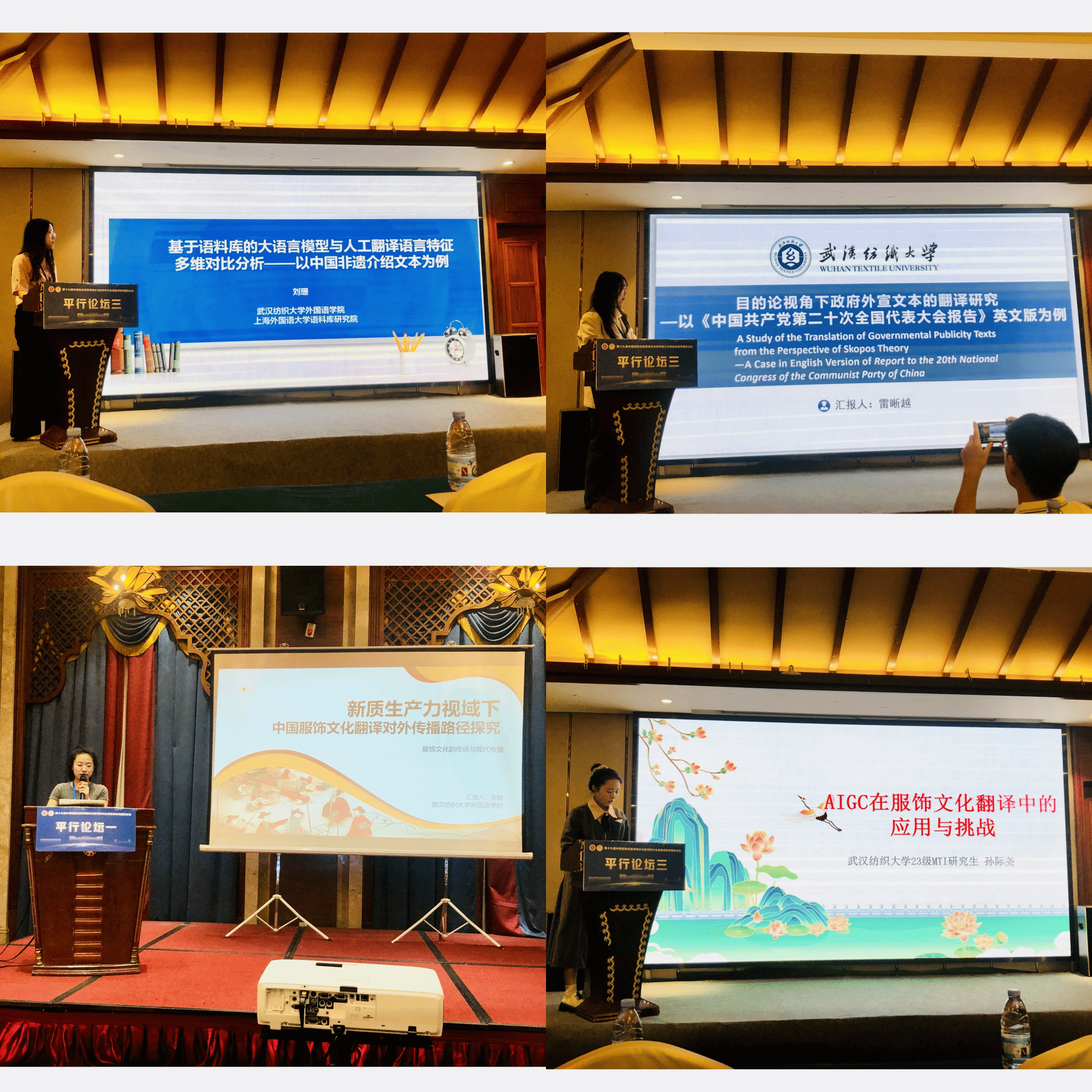 18日晚,MTI中心主任刘珊和23级研究生张敏、孙际尧、24级研究生雷晰越在平行论坛上作了主旨发言。刘珊就“基于语料库的大语言模型与人工翻译语言特征多维对比分析—以中国非遗介绍文本为例”进行了分享。23级MTI研究生张敏从新质生产力视域出发,探究中国服饰文化翻译对外传播路径,涉及服饰文化对外传播理念、四维度(译者、文本、机器翻译、网络平台)探究以及三业态(创新性、融合性、互动性)传播等内容;孙际尧探讨了AIGC在服饰文化翻译中的应用与挑战,并提出相应策略,包括其技术特点优势、应用方式、面临的语言准确性、文化适应性和创造性翻译局限等挑战,以及数据质量控制、人工审核、算法优化等应对策略。24级MTI研究生雷晰越从目的论视角研究政府外宣文本的翻译,以《中国共产党第二十次全国代表大会报告》英文版为例,探讨政府外宣文本的特点以及目的论的翻译三原则,并分析报告中的翻译策略。
