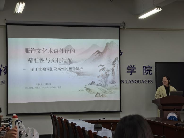 商务英语12301班学生赵凡雨以“服饰文化术语外译的精准性与文化适配”为主题进行分享。她指出,服饰文化术语的翻译需兼顾专业规范与文化内涵:如将“龙袍”译为“Loong Robe”,以规避西方文化中“Dragon”的负面意象;“马蹄袖”等术语采用“特征描述+部位名称”的结构译法,增强表述的直观性。对于“黄袍加身”典故、“终始五德说”等文化内容,她提出通过核心词汇替换、文化概念简化等方式,在保留核心内涵的基础上降低英文读者的理解门槛,实现文化传播的有效性。