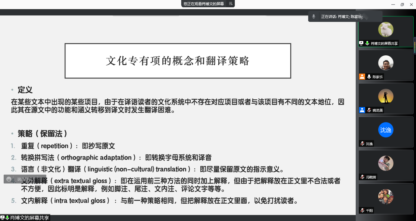 11月17日晚,bv伟德国际1946第26期“经纬译学”研究生论坛成功举办。本次论坛由姚范美副教授主持,20级研究生冯晓苗和21级肖博文同学主讲,bv伟德国际1946副院长罗绮伦副教授、郑亚娟副教授和全体翻译硕士研究生参加此次论坛。