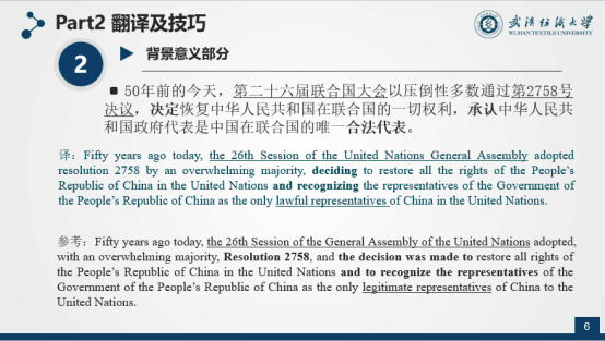 第一位展示者冯晓苗同学分享视频并介绍了联合国相关事宜,以“习近平在中国恢复联合国合法席位50周年纪念会议的讲话翻译分享”为主题,将本次演示分为三大部分。第一部分文本解读介绍了联合国、联合国五常以及中国为恢复联合国合法席位所做出的历史性努力,为后面的译例做好背景知识铺垫。