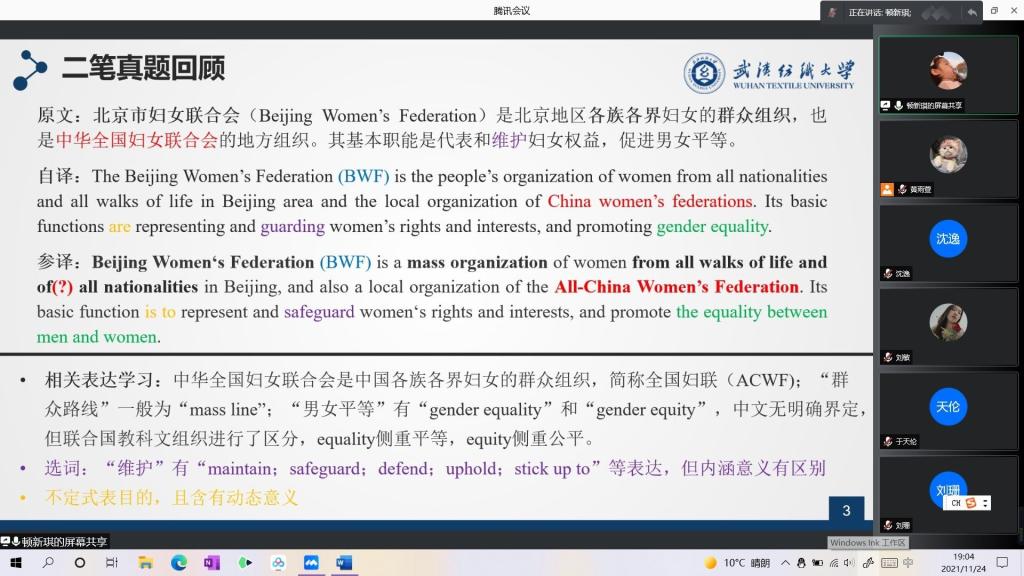 11月24日晚,bv伟德国际1946在线上成功举办了第二十七期“经纬译学”研究生论坛。本次论坛由MTI教育中心主任刘珊副教授主持,20级MTI研究生顿新琪和21级MTI研究生谢庆妮主讲。bv伟德国际1946院长谭燕保教授,陈奇敏副教授,赵伟副教授以及全体MTI研究生参与了此次研讨会。