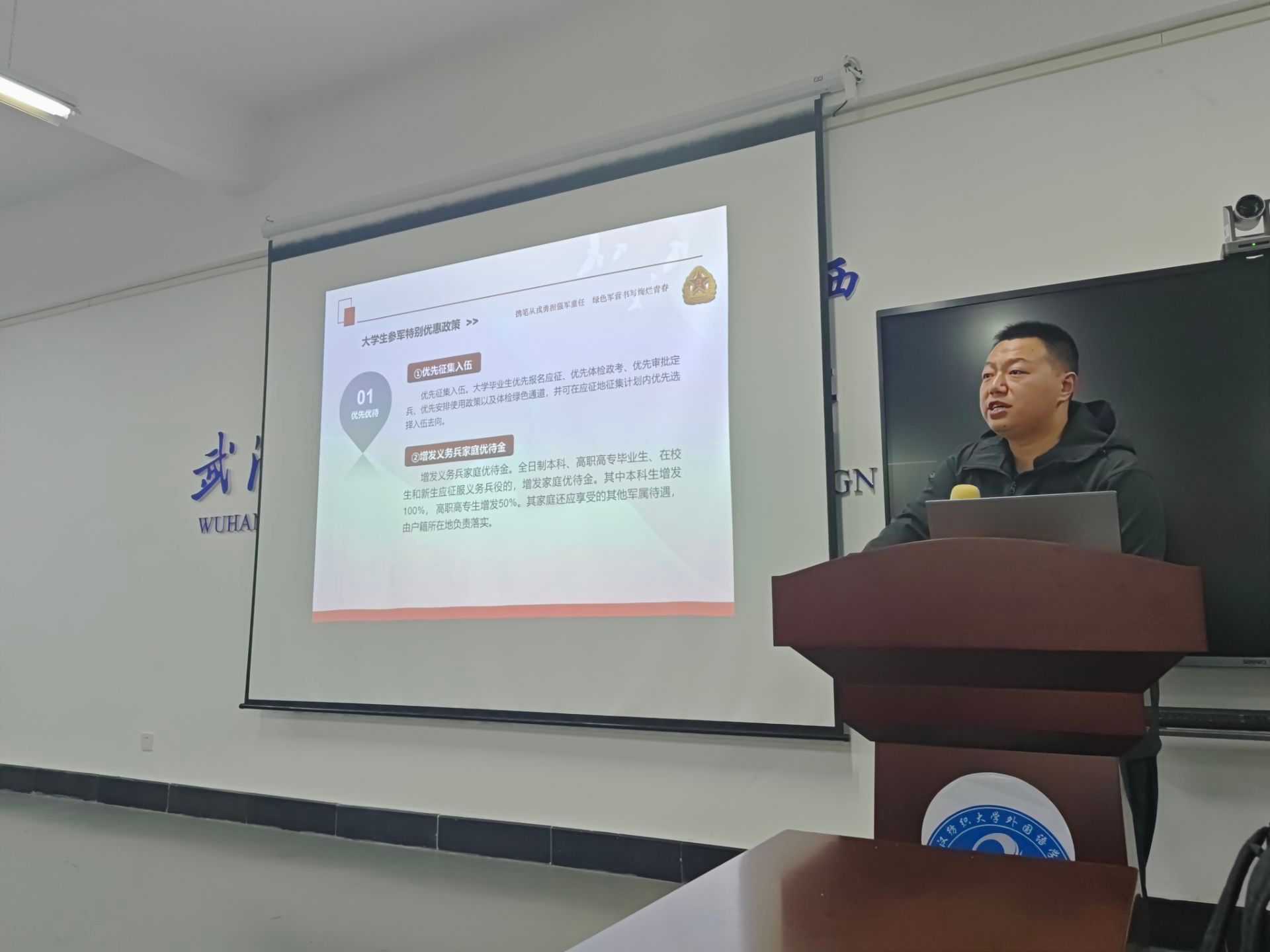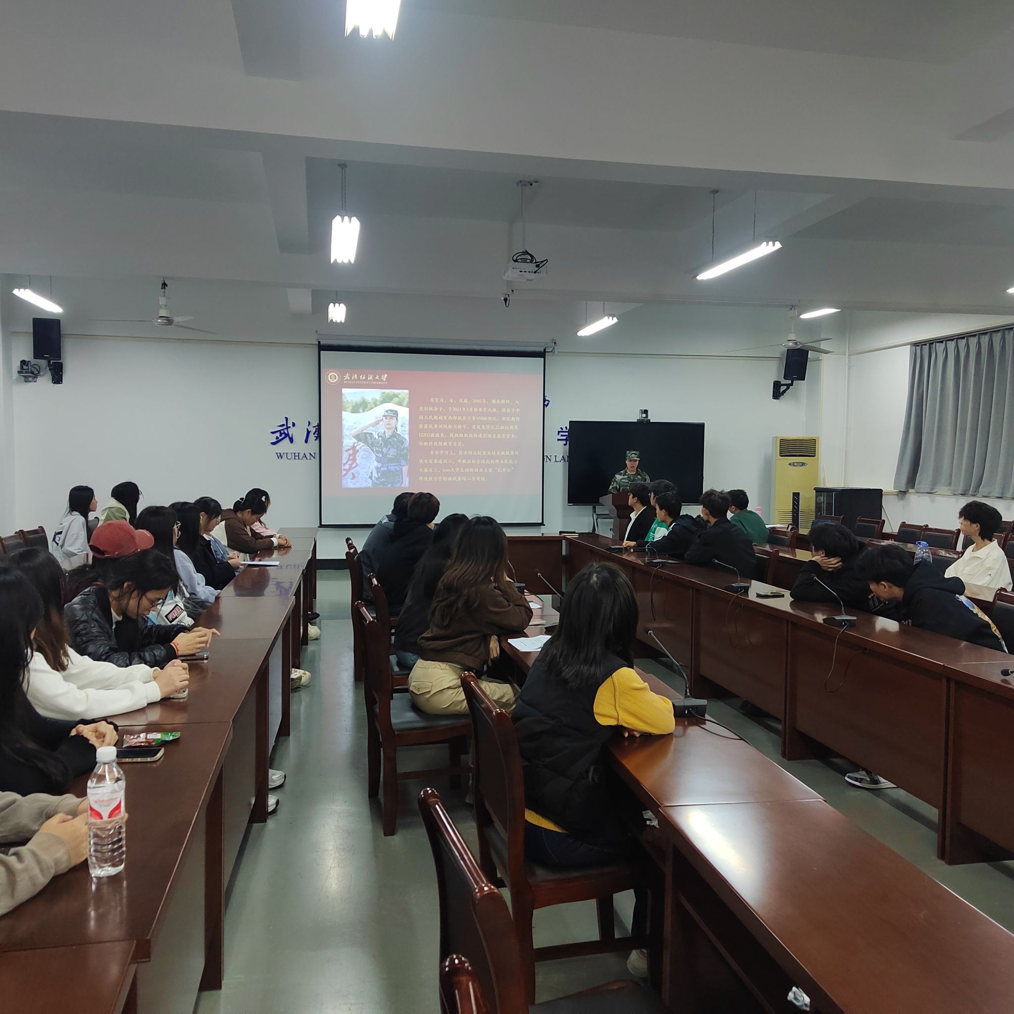 11月10日,各年级辅导员集中进行征兵政策宣讲解读,同时邀请退伍学生士兵进行朋辈交流活动。各年级辅导员重点从优先优待、选拔培养、复学升学、退伍就业等方面进行了深入介绍,进一步促进同学了解学校征兵入伍相关政策。退役大学生士兵、商英12202班学生肖雯洁给2024级学生开展了朋辈交流活动,她以自己的军旅生涯为切入点,从参军入伍的初心、入伍的成长历练、退役后回到学校的感受等方面进行分享,通过视频和图片向大家展示部队生活和退伍大学生的在校情况及毕业去向,让同学们更加直观地感受到军人的风采和担当,激发了同学们的爱国热情和报国志向。