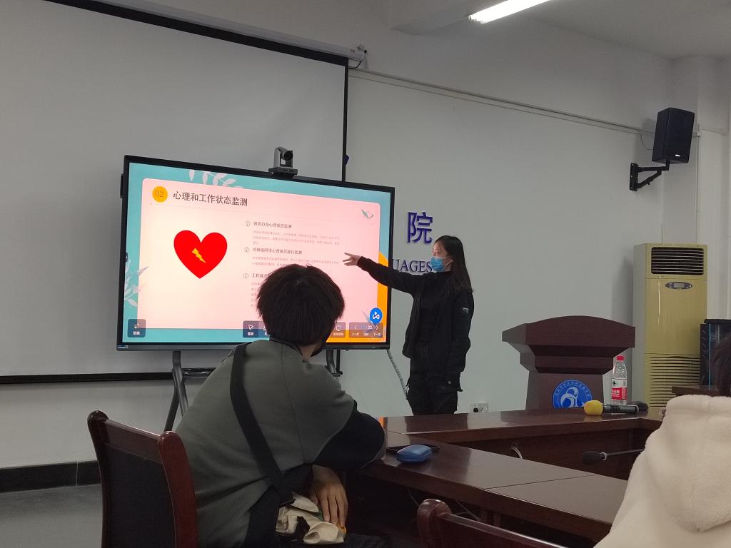 紧接着,周曦老师向大家介绍了大学生常见心理问题的几种主要表现,以及对大学生产生的影响和合理的解决策略,并讲述了高校突发事件的部分案例,深化了班委们对校园突发事件的认知。她表示,作为班委,既要学会调整自己的情绪和工作状态,也要多关注同学的身心发展,对于受挫和困难同学要坚持通过多渠道进行合理帮扶。
