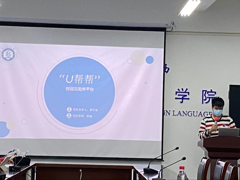 最后一位,是来自商英专业的袁宇辰同学,他带来的项目主题是《“U棒棒”校园互助平台》。在充分了解了学生校园生活的困难点后,袁宇辰同学运用了本专业知识,进行了“U棒棒校园互助平台的构想与设计,从投资、风险评估等方面对此项目进行了专业性极强的介绍,得到老师一直认可。