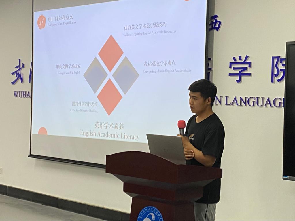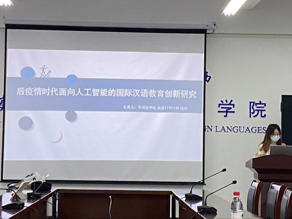 第三位进行展示的是来自英语专业的陆轩同学,她的展示主题是《后疫情时代面向人工智能的国际汉语教育创新研究》。基于当今新冠疫情背景,联系未来人工智能科技发展,英语专业的陆轩同学将两者与本专业知识相结合,为国际汉语教育未来发展提供新思路。
