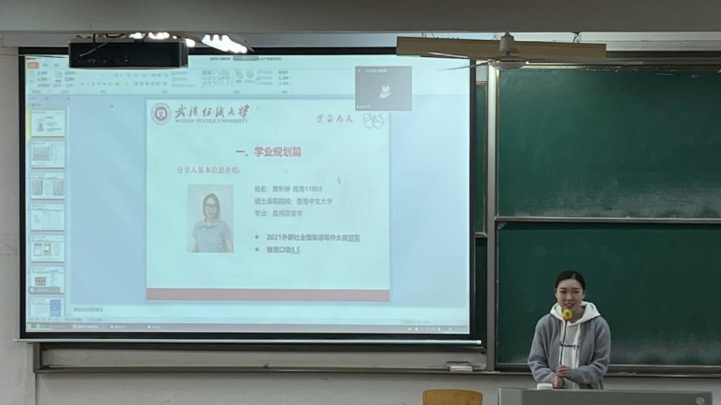 然后,黄昕婷学姐从提高英语基本能力和学科竞赛的选择及准备入手,分享了自己在英语学习之路上的经验方法。黄昕婷谈到,做好计划是一切的基础,听说读写能力的提高需要持之以恒地练习,日积月累才能产生质的飞跃,同时,学科竞赛的选择既要考虑含金量,也要结合自身的需求,以赛促学,实现价值最大化。最后,聂老师对两位同学的经验分享做出了总结,并鼓励同学们结合学姐们的经验,尽早规划好自己的道路,积极向身边的榜样学习。